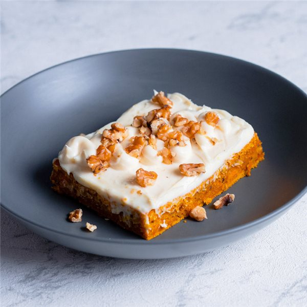 Zanahoria, harina de trigo (GLUTEN), queso crema (LÁCTEOS), huevo (HUEVO), azúcar moreno, aceite de girasol, azúcar glass, nuez (FRUTOS SECOS), mantequilla (LÁCTEOS), levadura en polvo, canela molida, vainilla líquida, nuez moscada. *Este plato puede contener trazas de pescado, sulfitos y/o apio a través de contaminación cruzada, todos nuestros platos se elaboran en el mismo obrador.