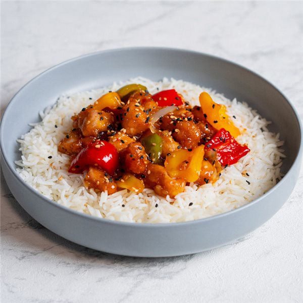 Carne de cerdo, arroz, salsa sweet chili (azúcar, agua, pasta chile rojo, vinagre destilado (SULFITOS), ajo, sal), pimiento, cebolla, caldo de pollo (agua, pollo, cebolla, aceite de oliva virgen, sal), aceite de girasol, almidón de maíz, sésamo (SÉSAMO), sal, pimentón dulce.