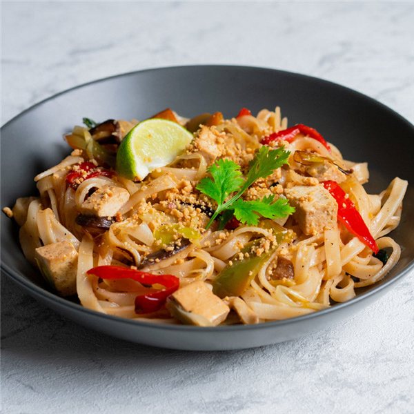 Tallarines de arroz, seta shiitake, tofu (SOJA), pimiento rojo y verde, tamarindo, ajetes, brotes de soja (SOJA), salsa de soja (agua, soja (SOJA), trigo (GLUTEN), sal, alcohol), cacahuete (CACAHUETE), caldo de verduras (apio (APIO), cebolla, puerro, tomate, ajo, calabacín, nabo, zanahoria, apio nabo, col), sriracha, azúcar, ajo, cilantro, jengibre, sal.