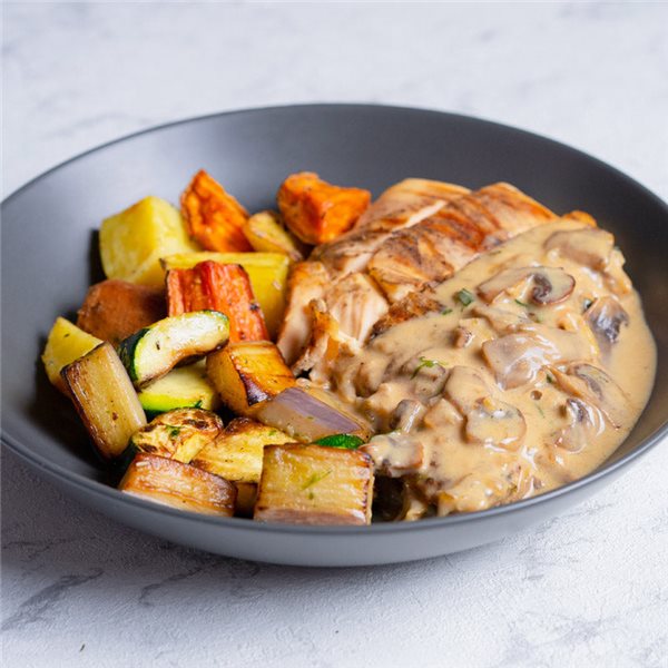 Pechuga de pavo, salsa de setas (nata (LÁCTEOS), champiñón, caldo de pollo (agua, pollo, cebolla, aceite de oliva virgen, sal), seta, cebolla, almidón de maíz, mantequilla (LÁCTEOS), aceite de oliva virgen, sal, coñac, caldo ternera (agua, grasa de ternera, extracto de ternera, caldo de hueso de ternera, sal, aroma natural, extracto de levadura, azúcar, almidón de maíz, zumo concentrado de setas, jarabe de caramelo de azúcar, maltodextrina (patata, tapioca), dextrosa cultivada, pimienta negra), ajo, estragón, pimienta), berenjena, calabacín, patata, boniato, aceite de oliva virgen, ajo, sal, pimienta, romero. *Este plato puede contener trazas de gluten, apio, huevo, sulfitos, frutos secos y/o pescado a través de contaminación cruzada, ya que todos nuestros platos se elaboran en el mismo obrador.