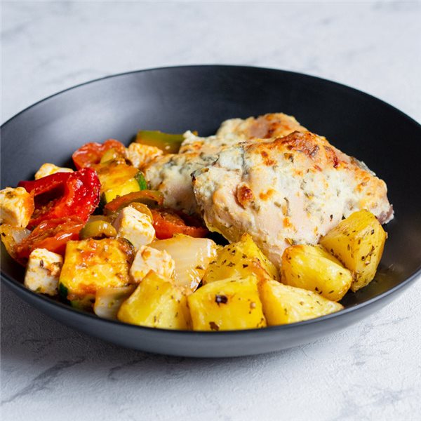 Contramuslo de pollo, marinada griega (yogurt natural (LÁCTEOS), zumo limón, azúcar, ajo, ralladura de limón, sal, pimienta, tomillo, hierbabuena, orégano), patata, pimiento, calabacín, cebolla, tomate cherry, nata (LÁCTEOS), queso feta (leche de vaca pasteurizada (LÁCTEOS), cuajo, fermentos lácticos (LÁCTEOS), sal), aceituna verde, tomate frito casero, aceite de oliva virgen, pasta de ajo, almidón de maíz, sal, hierbas provenzales (albahaca, orégano, romero, tomillo, ajedrea, mejorana), orégano, pimienta.