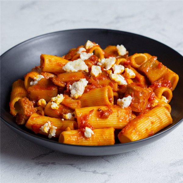 Pasta de trigo (GLUTEN, HUEVO), salsa de tomate berenjena (tomate frito casero, berenjena, seta cardo, cebolla, aceite de oliva virgen, albahaca, sal, azúcar, almidón de maíz, pimienta), nata (LÁCTEOS), queso de cabra (LÁCTEOS), aceite de girasol, sal.
