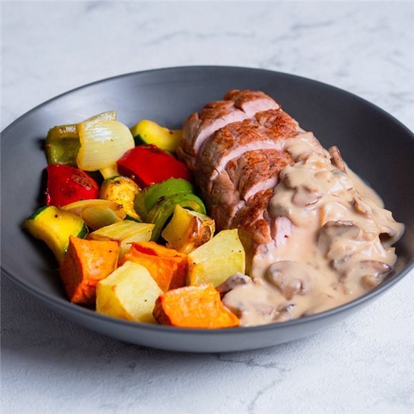 Solomillo de cerdo, salsa funghi (nata (LÁCTEOS), champiñón, caldo de pollo (agua, pollo, cebolla, aceite de oliva virgen, sal), cebolla, roux oscuro (GLUTEN), coñac, mantequilla (LÁCTEOS), sal, concentrado de carne (GLUTEN, APIO), pimienta), patata, boniato, cebolla, pimiento, aceite de oliva virgen, sal, pimienta. *Este plato puede contener trazas de huevo, frutos secos, sulfitos y/o pescado a través de contaminación cruzada, ya que todos nuestros platos se elaboran en el mismo obrador.
