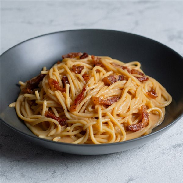 Pasta de trigo (GLUTEN, HUEVO), caldo de pollo (agua, pollo, cebolla, aceite de oliva virgen, sal), nata (LÁCTEOS), guanciale, cebolla, queso parmesano (LÁCTEOS), coñac, caldo ternera (agua, grasa de ternera, extracto de ternera, caldo de hueso de ternera, sal, aroma natural, extracto de levadura, azúcar, almidón de maíz, zumo concentrado de setas, jarabe de caramelo de azúcar, maltodextrina (patata, tapioca), dextrosa cultivada, pimienta negra), pimienta verde, pimienta negra, almidón de maíz, sal, aceite de girasol.