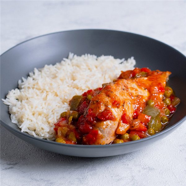 Pechuga de pollo, arroz, salsa chilindrón (tomate frito, tomate triturado, guisante, cebolla, pimiento rojo, verde y amarillo, vino blanco (SULFITOS), ajo, perejil, tomillo), aceite de girasol, sal.