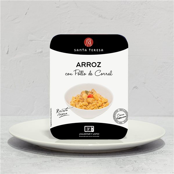 Arroz con Pollo de Corral 300g combina contramuslos de pollo de corral jugosos con un arroz suelto y aromático, cocinado junto a verduras frescas seleccionadas y un toque de aceite de oliva virgen extra que realza todos los sabores. El resultado es un plato equilibrado, con textura del arroz firme pero tierna, y pollo tierno que conserva su carácter natural.
